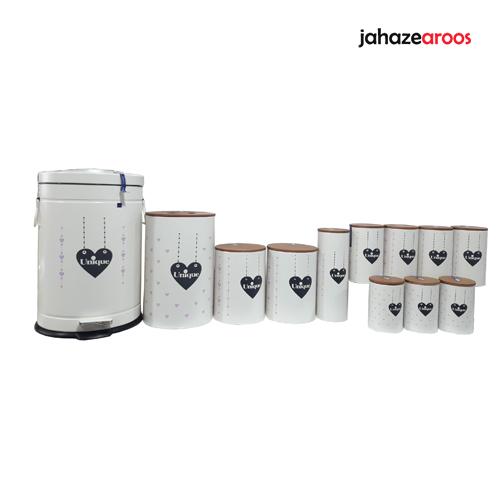 سطل برنج ، سطل زباله ، 2عدد ظرف قند و شکر ، بانکه اسپاگتی ، 4 عدد بانکه بزرگ ، 3 عدد بانکه متوسط |