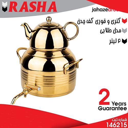 کتری قوری کف چدن مدل طلایی RASHA : RASHA یکی از برندهای معتبر و معروف ایرانی است که کار تولید انواع مختلف سماور و کتری قوری را انجام می دهد. این برند ایرانی با تولید محصولات با کیفیت و متنوع توانسته جایگاه بسیار خوبی را در میان مشتریان ایرانی کسب کند. تولیدات این مجموعه دارای تنوع بسیار زیادی هستند و رنگبندی آن ها نیز بسیار متنوع و زیبا می باشد. علاوه بر این قیمت محصولات این برند نسبت به کیفیت آن بسیار مناسب است و این امر موجب شده تا همه روزه افراد بسیار زیادی جهت خرید تولیدات این برند به بازار ها و مراکز فروش حضوری و غیر حضوری مراجعه نمایند.کتری